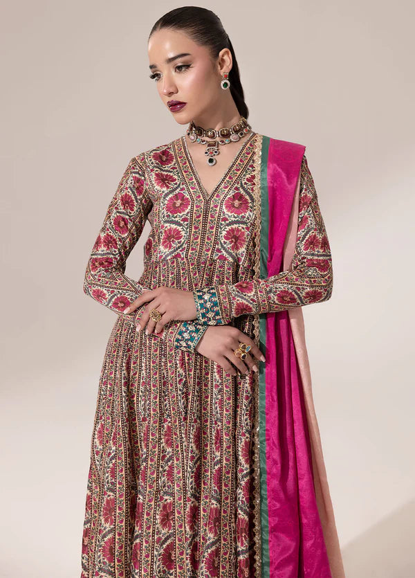 The outfit consists of a top with digitally printed front and back as well as digitally printed sleeves. The 20 kalis are also digitally printed, both at the front and back. The ensemble is complemented by a digitally printed silk dupatta and a dyed silk trouser. Adding a special touch are the sequins embroidered silk border on the ghera and the sequins embroidered silk border on the sleeves.