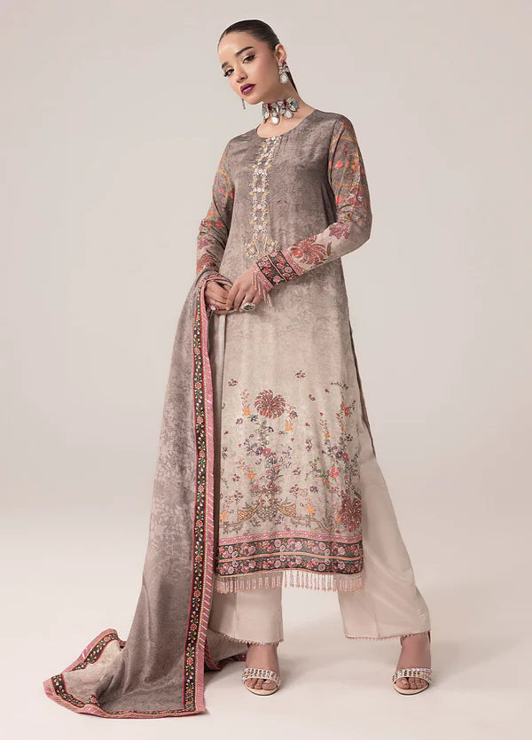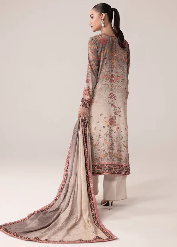 The outfit consists of a front made from digitally printed handwork silk, a digitally printed silk back, and digitally printed silk sleeves. The ensemble is complemented by a digitally printed silk dupatta and a dyed silk trouser.